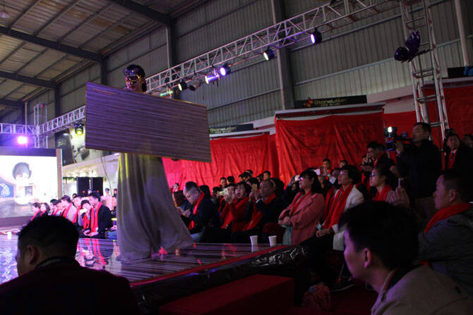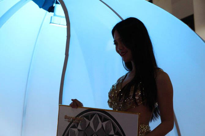 华夏陶瓷网记者注意到,本次新品发布的主题是“蝶恋石”,现场布置了数个蝴蝶造型的帐篷,帐篷内陈设的就是要发布的新产品,而负责产品展示的靓模面上戴着的也是蝴蝶面具,其形式比较新颖。“蝶恋石”发布会的设计负责人,施朗格设计部经理杨建雄告诉记者,石材本身太“硬”,在新品发布时需要让它“软”一下,所以采用了“蝶恋石”的创意。而这个创意的来源,则是他本人无意中看到一只蝴蝶受到了启发。