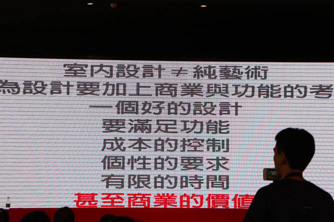同样来自台湾的设计师张清平是当天演讲环节的压轴嘉宾,他认为设计就是“想别人所未想,做别人所未做”,他说,“重点在于你发现多少关键性的问题,然后解决它”。对于设计师品牌打造,张清平的观点是能复制的设计才是风格品牌,有标准的设计才能做好品牌基础。张清平认为,室内设计业是一种服务业,赖以为生的只有一个“口碑”,因此设计师要将每个项目当作一次学习的机会,但又不能把项目当作实验。“室内设计是解放了藏在石头内的大卫”,张清平引用米开朗基罗的话之后同时表示,室内设计不等于纯艺术,设计师要为设计加上商业与功能的考量,一个好的设计“要满足功能、成功的控制、个性的要求、有限的时间甚至商业的价值”。“销售不是卖,是帮别人买;室内设计也不是卖,而是帮甲方完成一个梦”,张清平认为要成为有智慧、可独立的设计师,就要“懂得如何在设计工作的过程中产生喜悦;简单做正确的事,分辨轻重缓急与是非;不是花很多时间画很多图,要有方法;懂得借力使力,确实掌握时效;不断学习成长,掌握流行语言;善于正确地凸显自己表达自己;善用EQ沟通”。此外,张清平还提出了设计的“心东方”、“心奢华”概念,以及在设计中如何使用“蒙太奇”手法,让到场设计师赞叹不已。