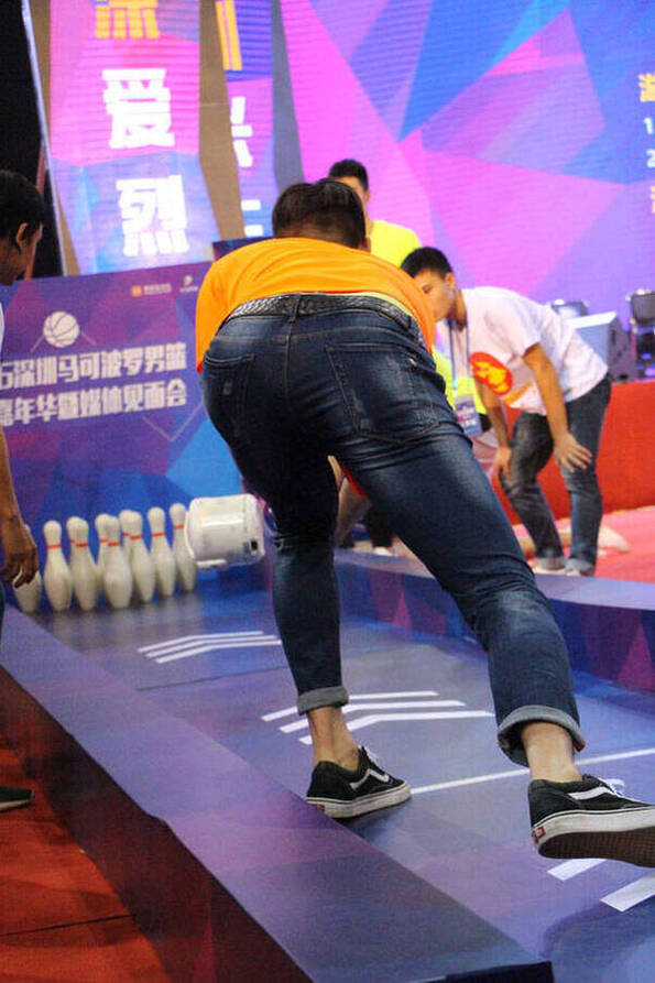 最有趣味的游戏环节当属“特殊保龄球大赛”,参与者随机抽取工具来击打保龄球瓶,结果他们抽到的工具是电饭锅、盆子、篮球、单肩包、水桶、军用水壶、大哥大,打保龄球的方式各不相同,有的像扔飞盘,有的像踢足球,当然结果也是相当的不一样,有人打倒了所有球瓶,有人则直接打了个“脱靶”。外籍球员帕戈,当晚一直不甘寂寞,在打保龄球时,他背对球瓶,叉开双腿,从两腿间朝后击打球瓶,结果——他要的不是结果,而是这个“耍宝”的过程。