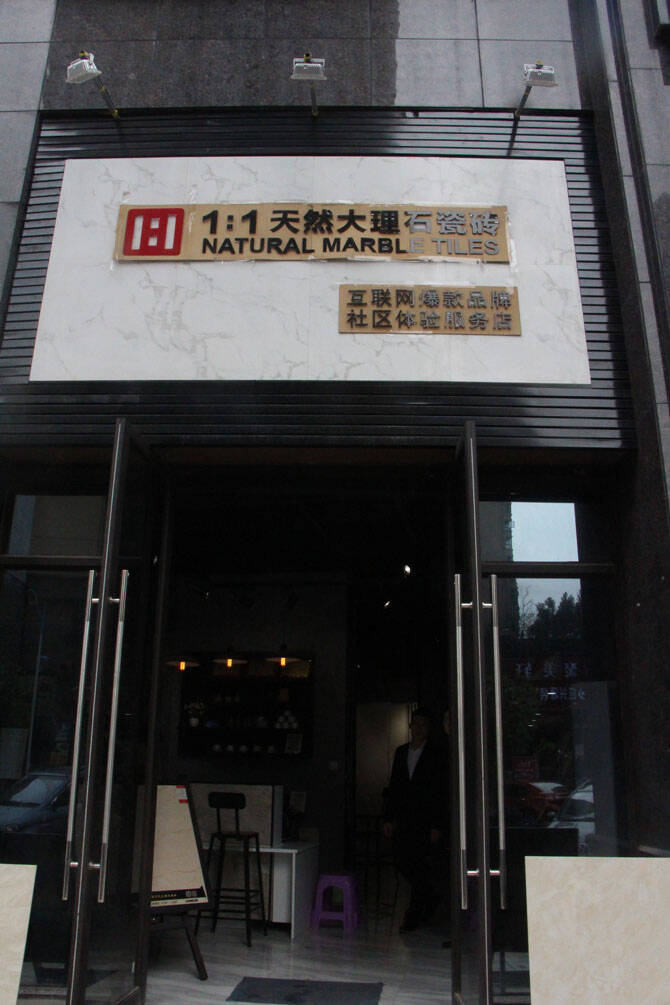 记者注意到,1:1瓷砖罗村社区店内,共展示了9款800mm×800mm规格的大理石瓷砖、6款150mm×800mm的木纹砖,主要是用展架进行展示。其中大理石瓷砖的售价每片大约100元,木纹砖的售价大约每平方米六七十元。黎允亮表示,用展架模式进行展示,一是建店快(该店7天完成建店),二是成本低(全店装修成本8万元左右),并且展架可重复使用。他告诉记者,1:1瓷砖今年的招商目标是新增300家经销商,但总部并不会强求经销商立即建店,而是希望经销商利用原有渠道和店面快速经营,在合适的时机再建店。