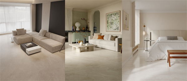 在空间的功能美学层面,该系列堪称视觉扩容的大师。通过国际化规格体系与子母砖套系的秩序美学,以严谨对缝铺贴减少视觉碎片化,营造出超越实际面积的通透感与延伸感,赋予空间“呼吸”的自由。“双触面”的创新设计,则赋予了光线与空间互动更大的主动权:亮光面通过光线引导实现空间视觉放大,哑光面则用细腻质感沉淀氛围塑造静谧场域,亮与哑的智慧组合,让每一寸空间都能精准服务于视觉延展与功能分区的双重目标。