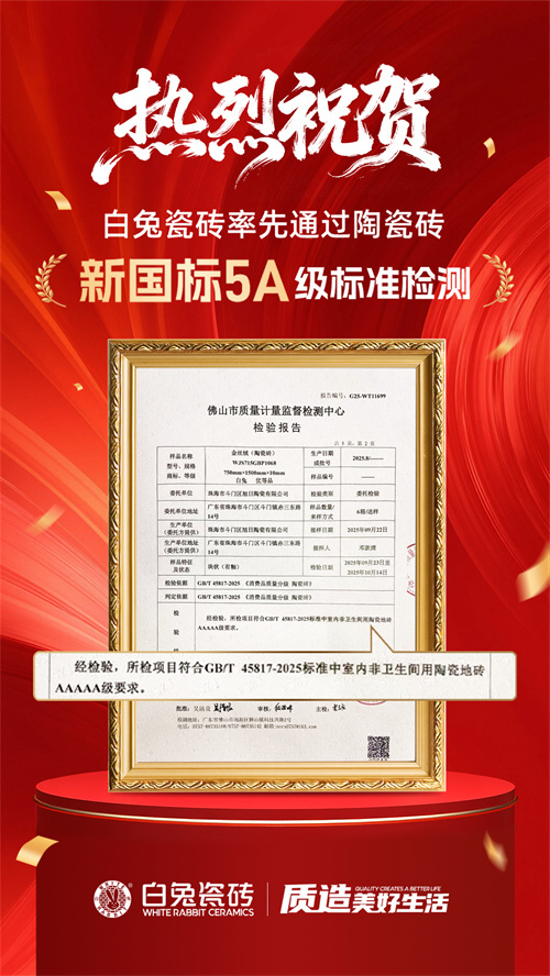 2025年,中国建材行业迎来历史性变革——《消费品质量分级 陶瓷砖》国家标准(GB/T 45817-2025)将于12月1日正式实施,标志着陶瓷砖产业迈入“质量分级、精准评价”的新纪元。在此行业转折点,白兔瓷砖送检产品经国家级权威检测机构严格测试,成功通过GB/T 45817-2025新国标认证,成为行业内首批通过新国标AAAAA级(5A级)最高质量等级认证的品牌之一,以硬核实力诠释“品质创造”的企业内核,为行业高质量发展树立标杆。