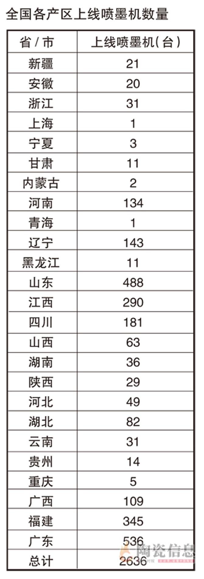 2010年底,全国仅有喷墨机12台,2011年新增88台,2012年新增650台,2013年是喷墨机设备最火爆的一年,全年新增喷墨机1250台。至2014年,根据由中国建筑卫生陶瓷协会和陶瓷信息报社共同发起的新一季“陶业长征IV——全国陶瓷砖产能及产区发展大型实地调研活动”目前所掌握的数据显示,全国上线喷墨机2636台。