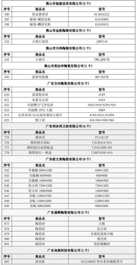 第二批名单包括:新中源陶瓷、王者瓷砖、金牌天纬陶瓷、强牌陶瓷、金舵、嘉俊陶瓷、罗兰伯爵瓷砖、方向企业、尚韵、依诺岩板、依诺瓷砖、卡米亚、意特陶、卓远、通利大理石瓷砖、华鹏陶瓷、裕成瓷砖共计17个。